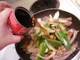 now add in your meat. sorry about the dark picture, my hands were all steak-y and i didn't get the flash on. you want the heat to be really high so you can sear the outside of your steak, sealing in the juices so that it will be more tender.